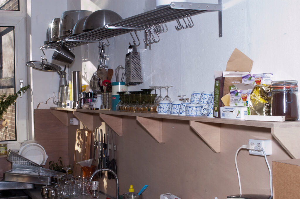 De tweede deur verschaft toegang tot de voormalige benedenwoning. Deze wordt gebruikt als tentoonstellingsruimte en leslokaal voor de Bcademie. Een initiatief van Daan den Houter en Alex Jacobs om de kloof tussen de kunstacademie en het autonome kunstenaarschap te overbruggen. Verder valt het oog meteen op de goed geoutilleerde keuken. Er is een zespitsgasfornuis, een strak betonnen aanrechtblad en een veelheid aan pannen. In de ruimte staan lange tafels met zitbankjes. Je kunt de benedenverdieping huren (www.restaurantjehuren.nl) als je een etentje wilt geven voor een aantal vrienden. De opbrengsten gaan naar de activiteiten die de gebruikers van het pand voor de wijk organiseren.