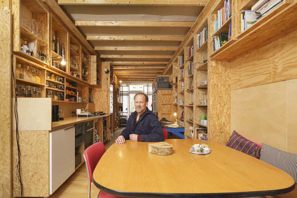 Op de eerste verdieping van nummer 35B vind je het kantoor. Een ruimte met een groot balkon en een boekenkast vol architectuurnaslagwerken, die zich langs de hele muur strekt. En dan nog liggen er stapels boeken op de bureaus, verspreid tussen de bonnenprikkers, maquettes, muziekinstrumenten en oude beeldschermen en printers. Je hebt geen deftig kantoor nodig om de stad toegankelijk te houden en mensen van betaalbare woningen te voorzien; wat telt zijn duurzame netwerken en kloppende systemen.